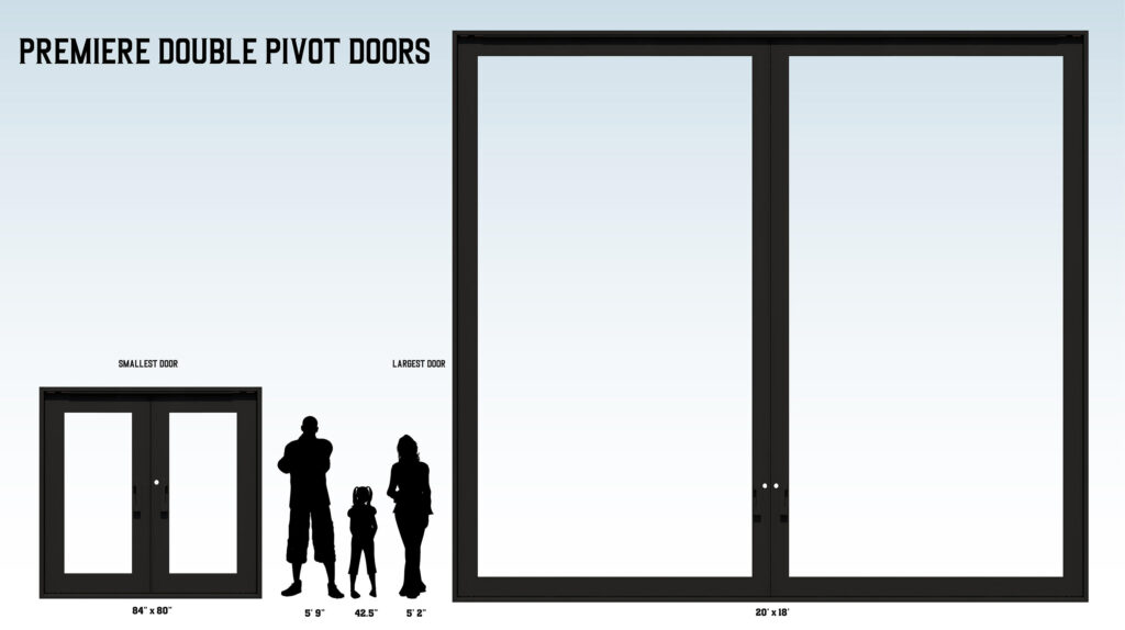Residential Inward/Outward | Commercial OutwardRight- or Left-Hand OpenPivot Hinges: 70/30 (17” offset) or 90/10 (5.5” offset)Hinge capacity: 10,000 lbs for effortless operationSizes: From 5’ x 6’8” up to 16’ x 16’+